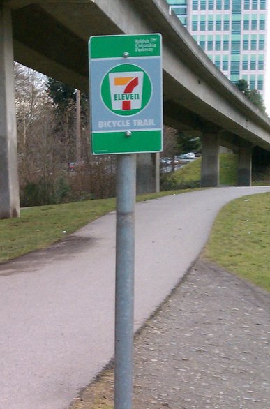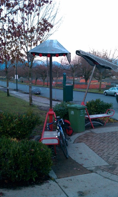 we decided to make the ride a loop (our route) and hook up with another cross-town special (eventually) and after some pretty incredible hill climbing ended up on top of a hill, heading down towards the skytrain tracks whereunder laid the 7-11 trail. yeah, look at that picture. it's almost as surprising as finding the mcdonalds health facility, but there it was, long and in ok repair, and much used since it funneled you to a skytrain terminal if you followed it long enough. there was art and great sunny weather and we made it home happy, though tired, a bit before dark. the latitude really gets to you up there, with the dark coming even earlier than portland. as we contemplated tired dinners and the siren song of pizza, we arrived home to find an invitation for a hanukkah meal with one of Heather's better friends in her group at school, and so we found a bit of variety at another cramped semi-organic grocer (fry broccoli and sliced garlic in a bit of oil for 1 minute on high heat, then lid and let steam for 5 minutes, salt and then you have simple pleasure!), a bit of booze, and then hightailed it to Jessie's house.