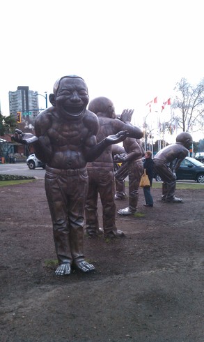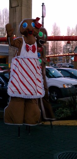 afterwards we went on a bit of a ride along the waterfront to the local quasi-arty-tourist-markety thing out on a well-connected island called granville. we perused artisan foods, food-colored arts, and drank some tasty beer at a major farmeresque market with nearby microbrewery just before heading up to a dinner party with Heather's landlords and some of their friends. but before we could even depart, we stumbled upon some very amorous gingerfolk. looming 12 feet tall and into the sloppy makeouts (though my camera wouldn't behave so you'll have to believe me--they snogged with spirit upon the slightest provocation!), they claimed to be honeymooning. yay, keeping vancouver weird! at any rate, the dinner party we ended up at sounds more somber--they were all gathering to remember a friend who'd died a year prior. But it was actually in quite good cheer, except for a memorial toast, and i met some really interesting folk--professional musicians, many, cyclists, a few, a filmmaker (his movie), (just the one) and more than a few drinks accompanied by very tasty noms. Heather was done by 10 but i helped shut the party down since i only needed to stumble downstairs, now with multiple offers to come visit folks next time i'm in town. whee!