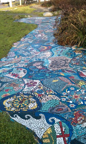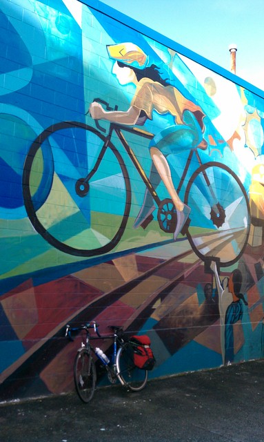 on my way back from shopping, i saw some excellent murals and a cute little pocket park that was full of mosaics, and took some pictures and thought to myself, "man, those mosaics look like cute little creeks". and then i thought "duh", as i saw the sign that labelled it mosaic creek park. this park was on a popular bike route that intersected the one that Heather lives on a few blocks away from her place, which was called the 'mosaic' route. and there were also (at least) mosaics on the roundabouts, a few houses with mosaic numbers. it was kinda neat to have a topically named route, tho confusing because the streets it used were none of them called mosaic drive. but anyway, happenstances involving cute public art are totally my kinda thing.