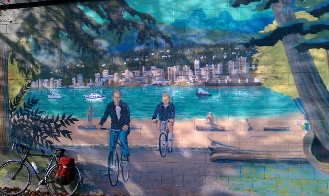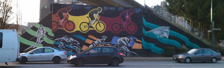 and speaking of, murals are seemingly even more a part of vancouver than portland and austin: even though both of those burgs are mural-friendly, vancouver is just overrun with the things. you'll see a few examples below. the last one there is on the side of a major road & train underpass along a bike route and while there is some graffiti there, it's minimal. it wasn't minimal along many other spots that weren't pre-arted intentionally, so my conclusion is: public art discourages lesser "public" art is definitely a budgetary win, even if i'm a bit conflicted about it as a lover of the better kinds of graffiti (see: banksy).