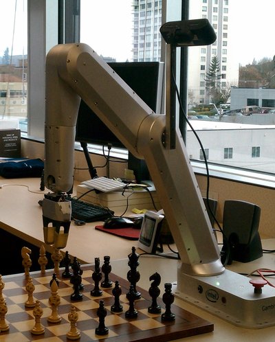 i soon arrived at Cyndy's lab and she demo'd her fantastic chess-playing robot, who was winning handily when i conceded. (in the picture, the 'bot is taking my queen.) that led to some good pho + chatting + the usual promises to visit more often, after which i skedaddled trainwards and got to be "that guy", who almost missed the train, sprinted to the baggage car to drop off my bike, and was just getting to my seat as the train rolled. fortunately, the train ride was smooth and pleasant and timely, and i worked and wrote this trip journal for much of it. fear not, points north, i shall return and soon! there are already plans to come up for velopalooza and for the sort of good times that knowing a few folks on the ground (bike camping on vancouver island? sure!)