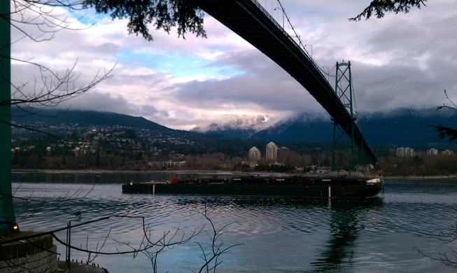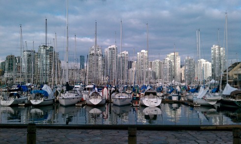 morning arrived earlier for me than accustomed, since i wanted the nickel tour of her school and had offered to ride to campus with her before classes to get it. but the way i saw it, i can sleep all day in portland so up i got and we rolled in the freezing, but somehow not quite slippery morning; the moisture was more in the form of frost than ice and this was in fact the beginning of an awesome 4 days of weather--i saw no rain at any time from my detraining to re-entraining at the vancouver amtrak station (and even a fair amount of sun, which judging from the reactions of the locals, is at least as rare in the vancouver winter as it is in PDX). Heather's campus is downtown and that was about all the time i spent on the streets amongst the highrises as opposed to riding the waterfront trail. not that downtown is bike-unfriendly, i just wasn't going anywhere else downtown. aside from a funny/embarassing moment wherein Heather bemoaned the required presentation style of an upcoming class in a stairwell seconds before we found the teacher of said class coming up from a lower floor; plus a great view of the harbor, her (satellite) campus was just another high-rise building with a remarkable number of windowless rooms, so i skedaddled onto one of my favorite stops anywhere foreign: a grocery store!